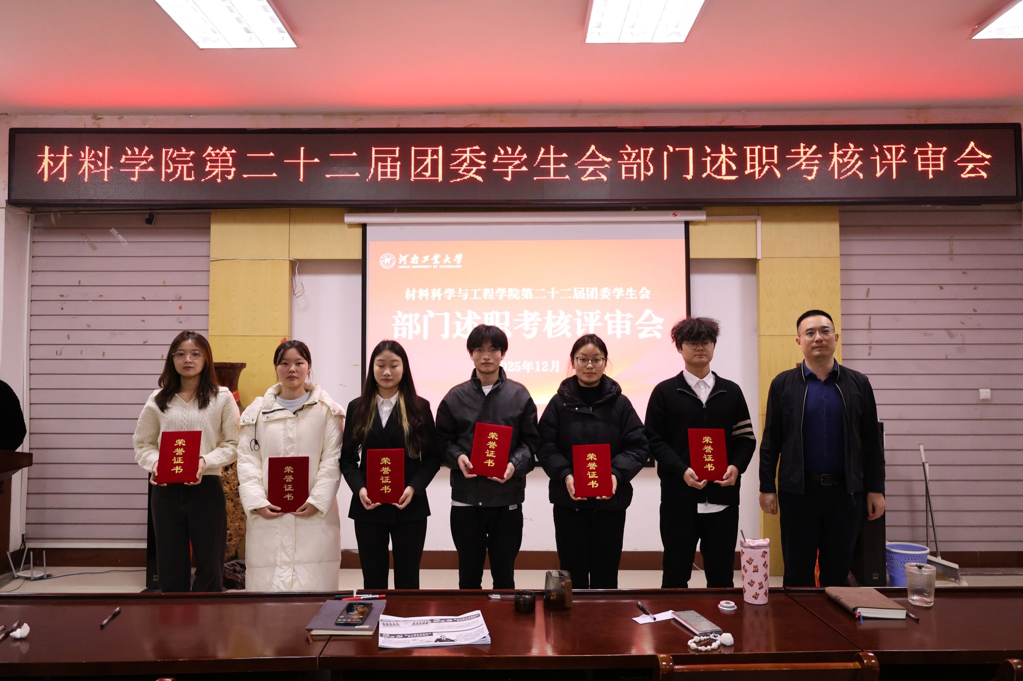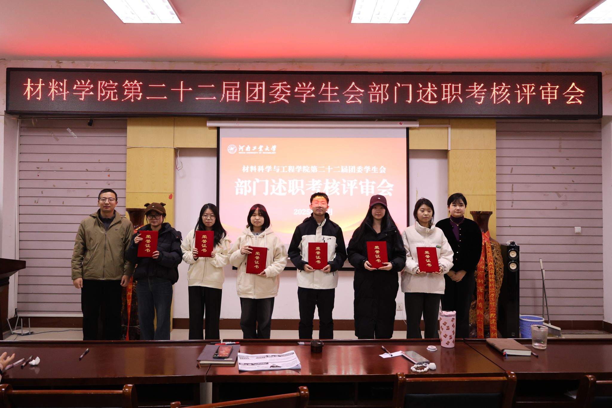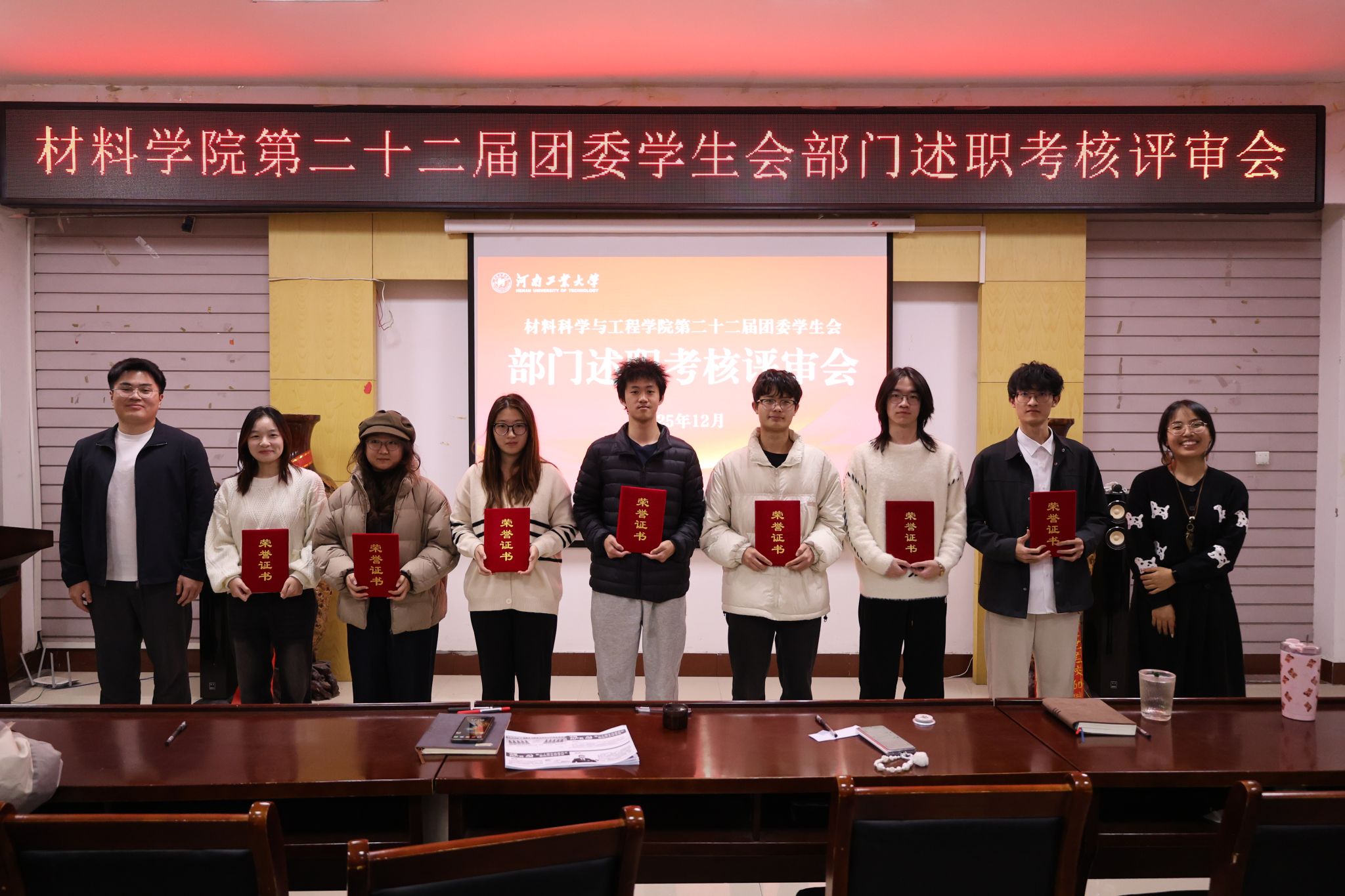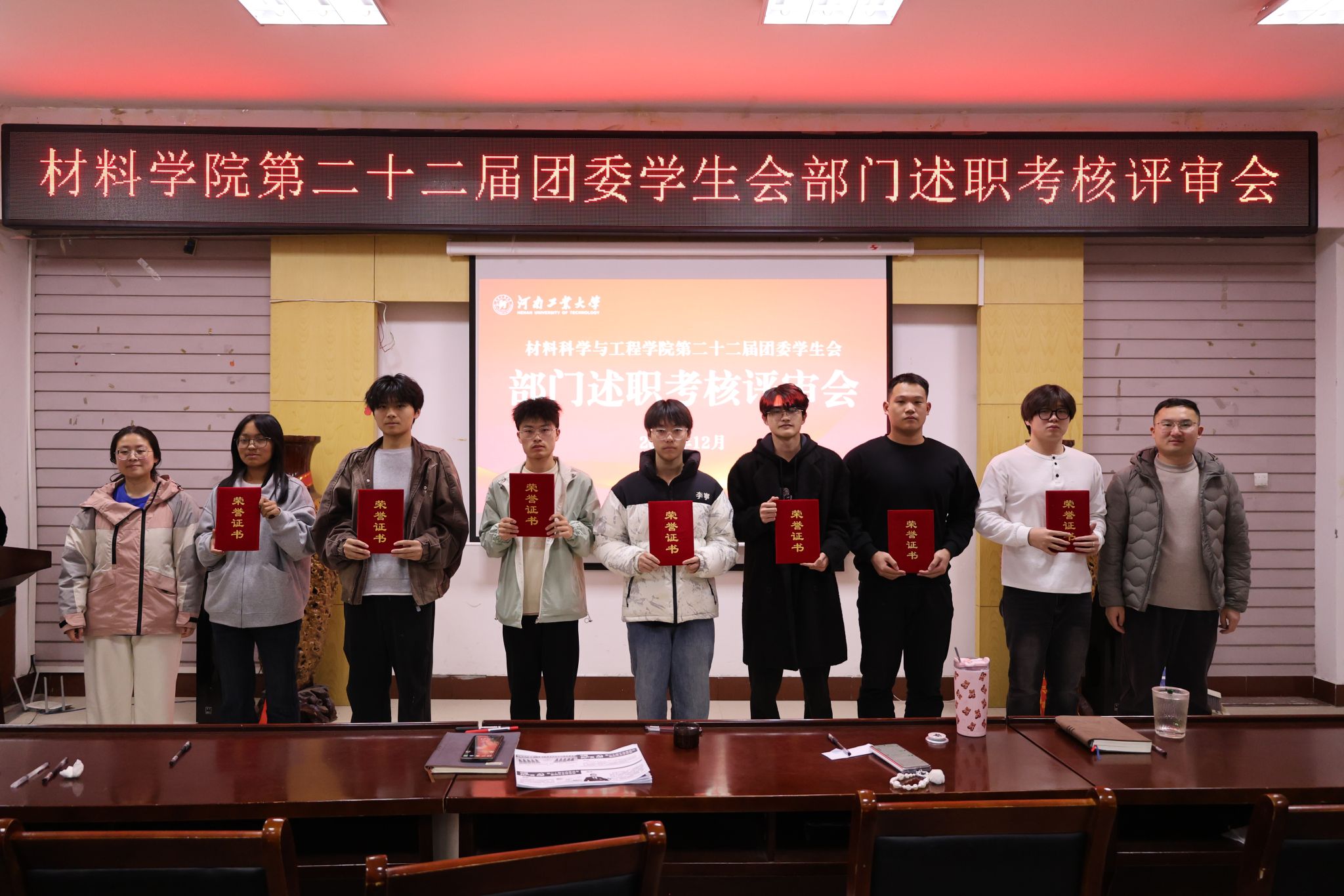 最后,参会老师为优秀部门和先进个人颁发荣誉证书并合影。本次述职考核评审会的召开为学生工作高质量发展注入了新动能。下一步,团委学生会将以“引领力、服务力、凝聚力、感染力、行动力”为抓手,在服务同学成长、助力学院发展的道路上持续奋进,以青春之力书写五育并举的育人新篇章。(撰稿:党崇原 摄影:段文博 温浩宇 审校:李建锋 审核:车愔)